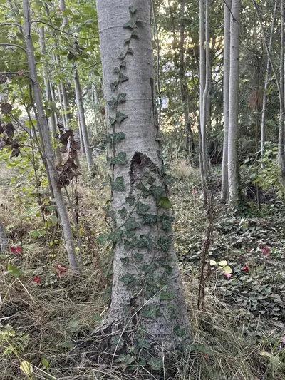 A tree trunk with green ivy vines climbing up its light gray bark surrounded by a stand of the same trees.