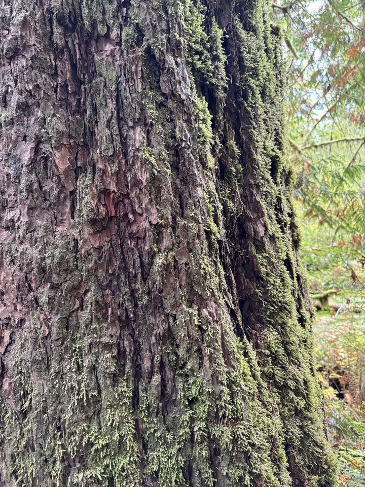Close-up of an old-growth trunk, furrowed bark draped in vertical moss, soft canopy behind.