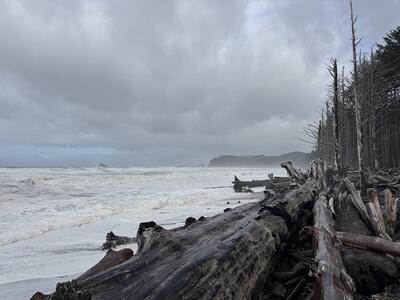 Panoramic view up the coast of Rialto Beach. Foamy waves pound the shore littered with giant driftwood, framed on the right by mostly dead trees, the misty coast in the center, underneath a slate sky.