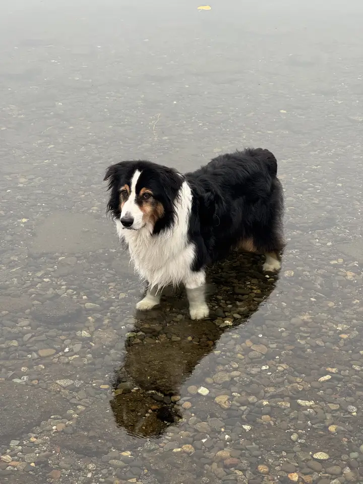 My black, white, and tan Australian Shepherd dog named Ki, standing in clear, shallow water over smooth pebbles, his reflection visible beneath him, attending to something off behind the camera.