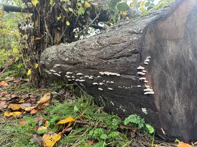 A fallen tree trunk on damp forest ground, sawn end facing the camera, dotted with small white bracket fungi in a line horizontal along it, nestled among wet leaves, moss, and bright green ferns.