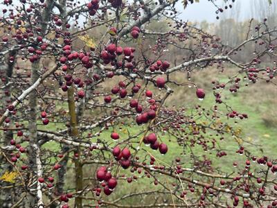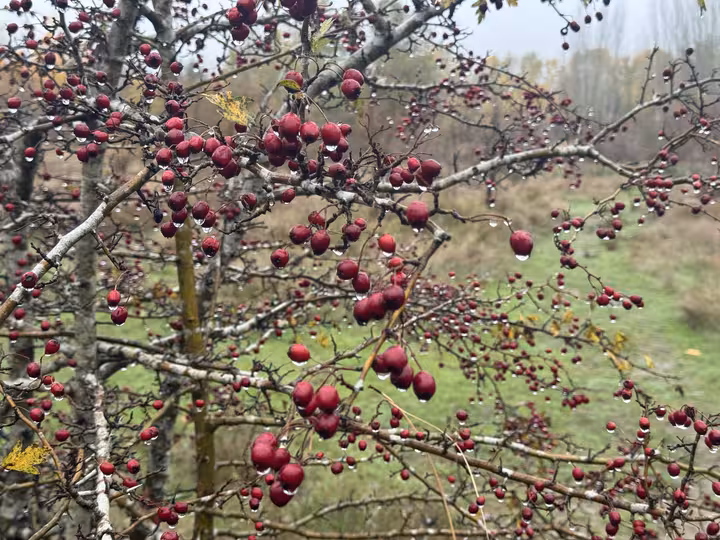 Close-up of thin branches covered in clusters of small red berries, each berry holding a raindrop, with a blurred, soft green field in the background.