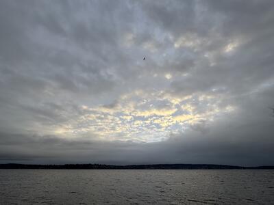 A dramatic cloudy sky breaking with golden light over the water at Magnuson Park, with a lone bird flying high above the lake headed to the right.