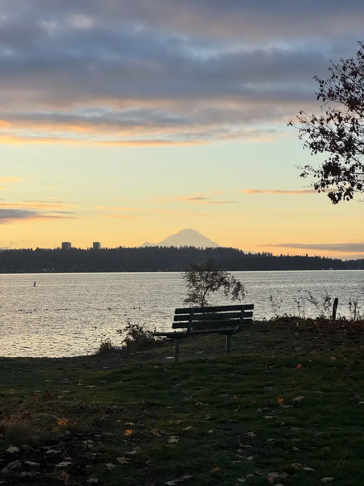 Empty park bench facing Lake Washington at sunrise, with a snow-capped Tahoma faintly visible beyond the dark opposite shore, pastel clouds above.