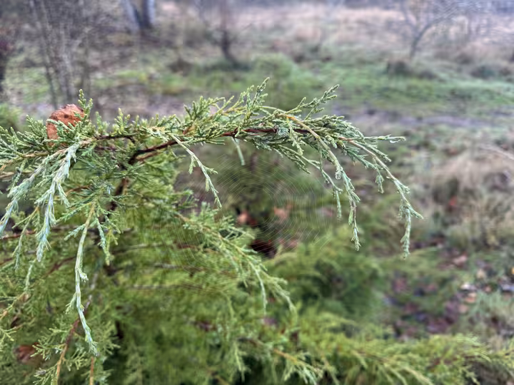 Dewy evergreen branch in sharp focus with a delicate spiderweb stretched between the shoots, set against a blurred, damp, grassy field.