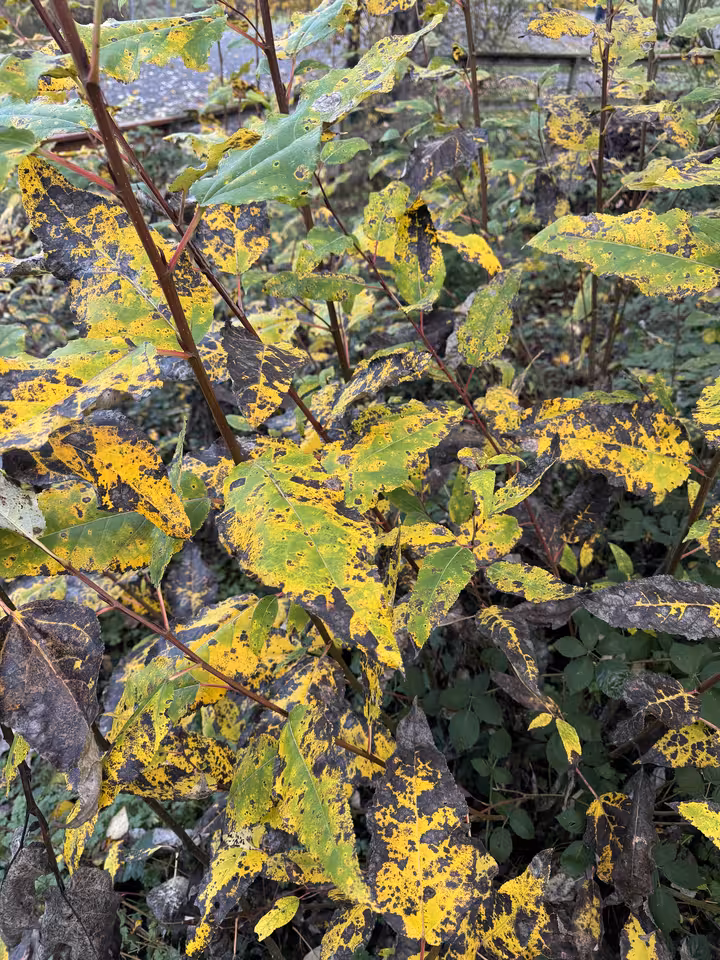 Ragged yellow and green leaves mottled with dark spots, layered densely over blackberry undergrowth.