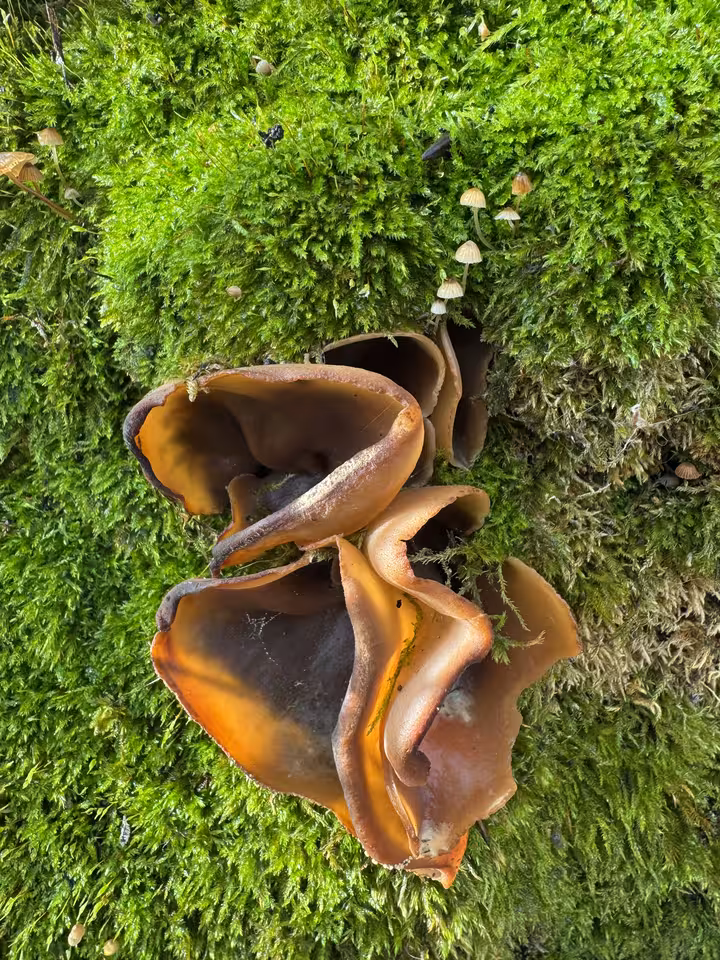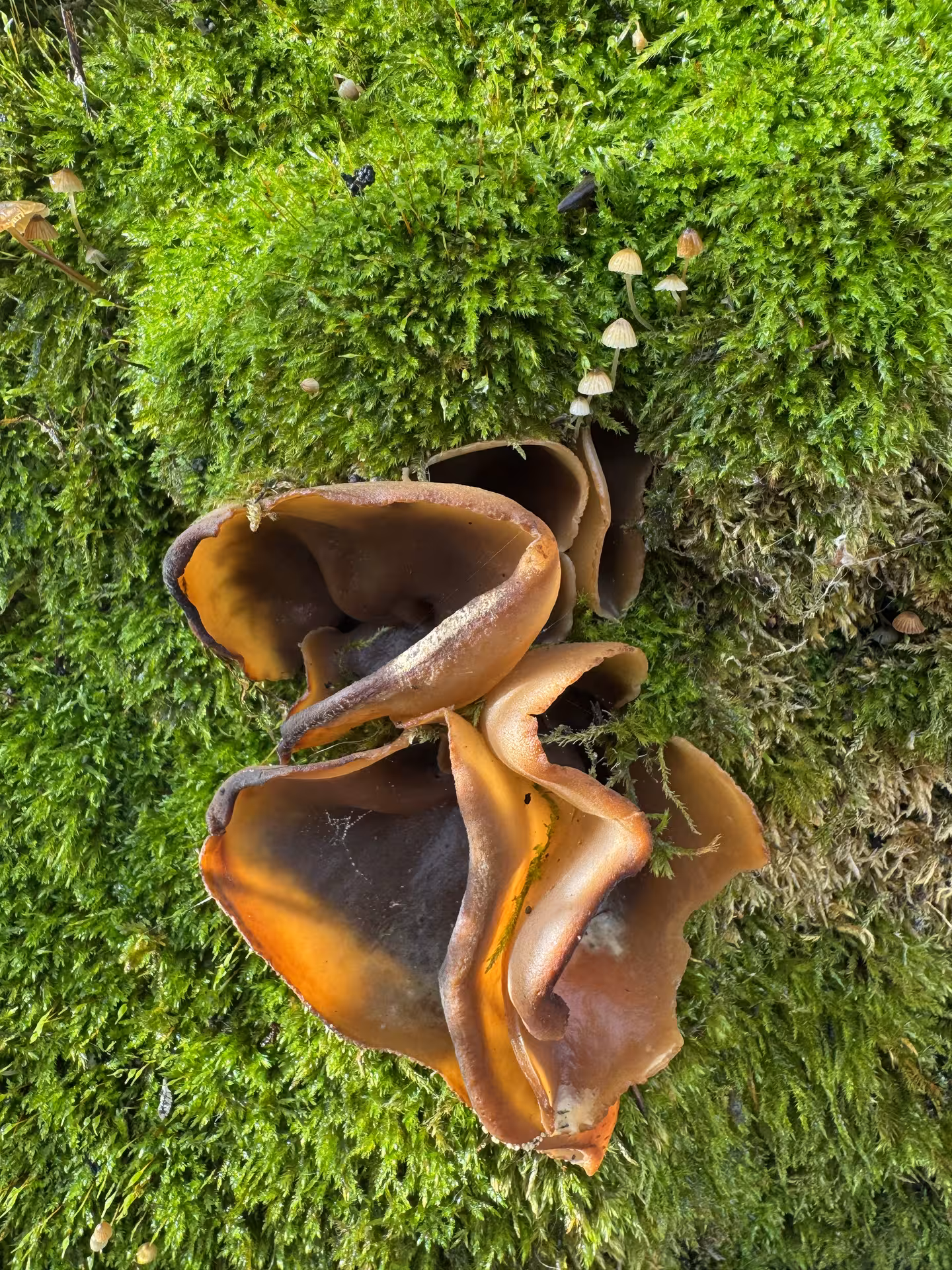 Close-up of ear-shaped amber-brown jelly fungus cups on a bright green mossy trunk, with tiny pale mushrooms sprouting from the moss above it.