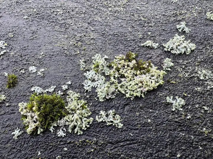 Pale green, frilly lichens and small tufts of moss growing on a dark, rough wooden surface.