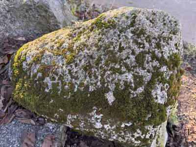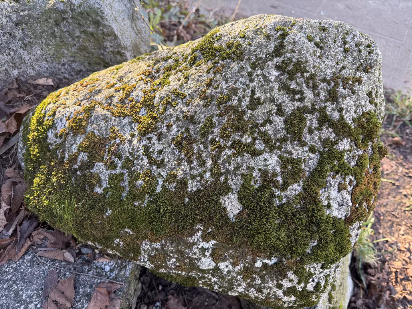 A sunlit gray boulder speckled with lichen and covered in patches of green moss, surrounded by dry leaves and dirt beside a sidewalk.