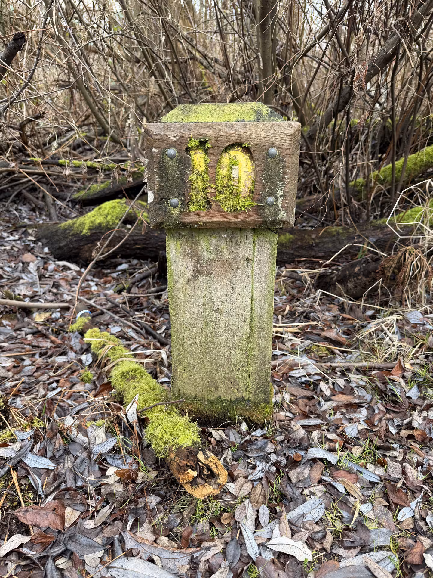 Photo of a weathered wooden post with a moss-covered "10" on a wooden plaque, surrounded by wet leaves and brush.