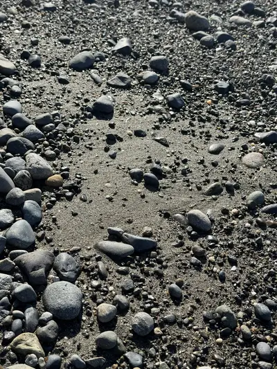 Pebbly beach sand dotted with smooth gray stones and dark gravel, with a curved patch of bare sand in the center.