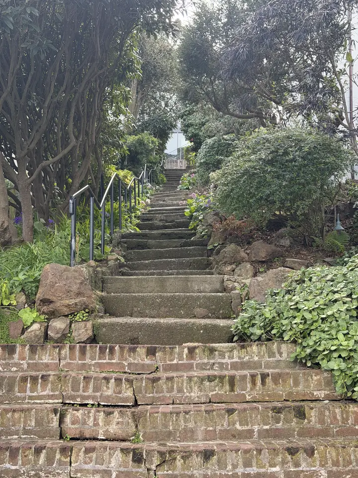 A steep outdoor stairway of worn concrete steps, bordered by rocks, shrubs, and trees, with metal handrails leading upwards.