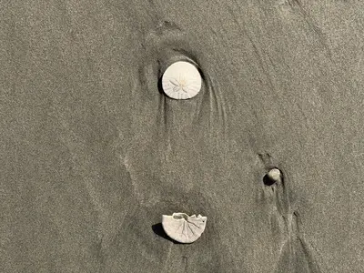 Two sand dollars on wet sand with thin water trails in the sand curving around them back towards the ocean.